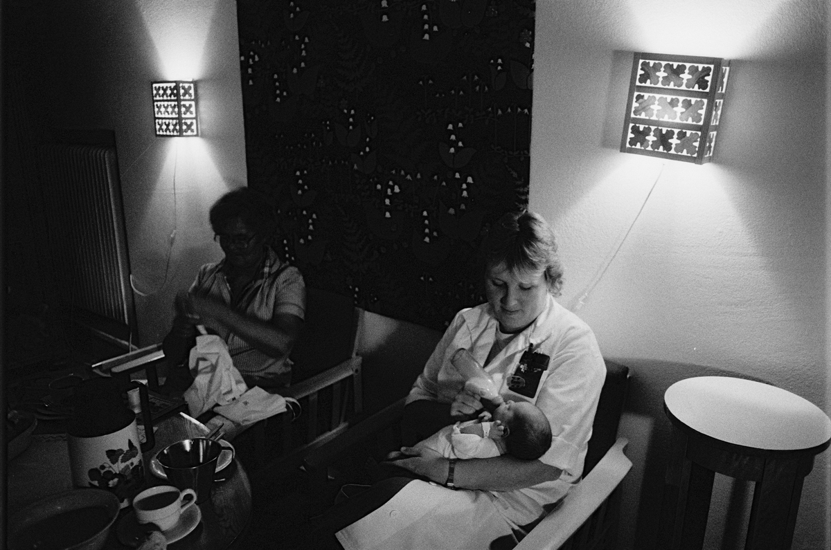• Nattpersonal på expeditionen, ett spädbarn matas med nappflaska, lättvårdsavdelningen Ringblomman, Gillbergska barnhemmet, Sysslomansgatan 37 - 39, Uppsala 1986