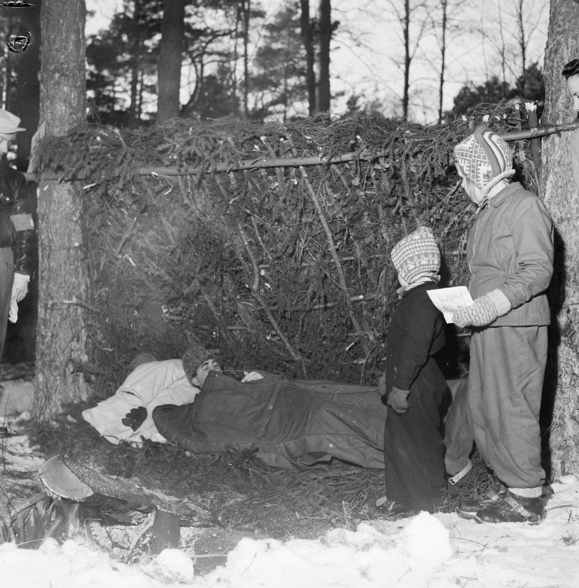 • Skidans dag, man ligger i sovsäck vid vindskydd av granris, Uppsala, februari 1948