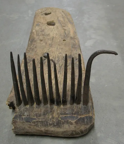 • Linrepa av trä försedd med metallpiggar varav de två yttersta är böjda, ena hörnet skadat.