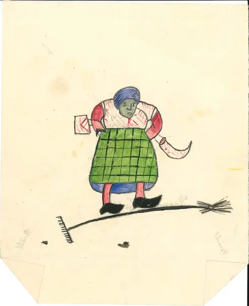 Påskbrev med en mörkhyad kvinna stående på en kvast kombinerad med en kratta. Kvinnan har ett horn runt ena armen och ett brev runt den andra.