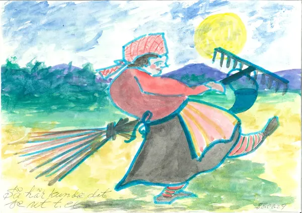 Påskbrev, som egentligen är ett exempel på ett dylikt, med en påskkäring sittande på en kombinerad kvast och kratta. Runt krattskaftet hänger ett horn.
