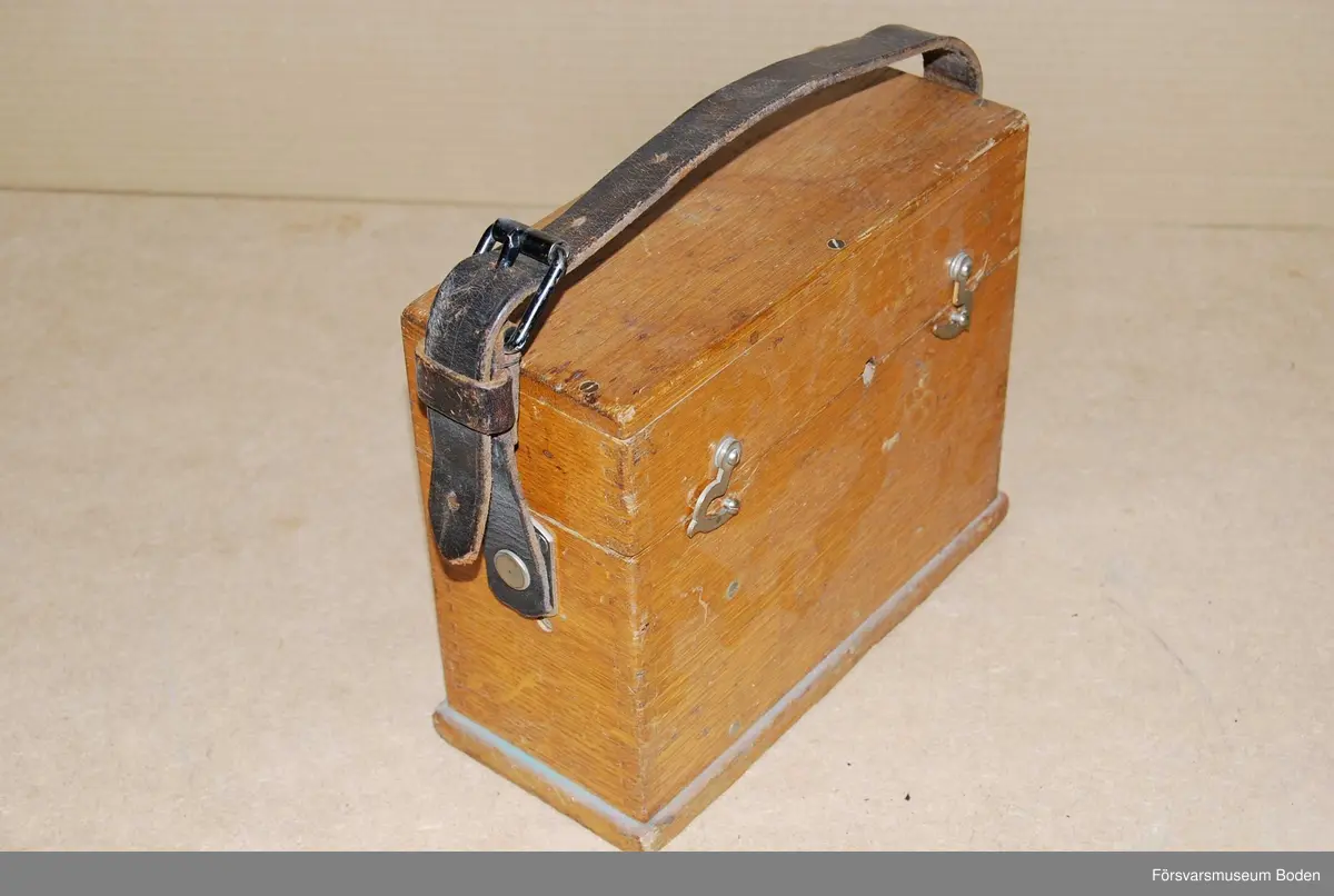 • Med trälåda försedd med bärrem. På lockets insida finns beskrivning och kopplingsschema.