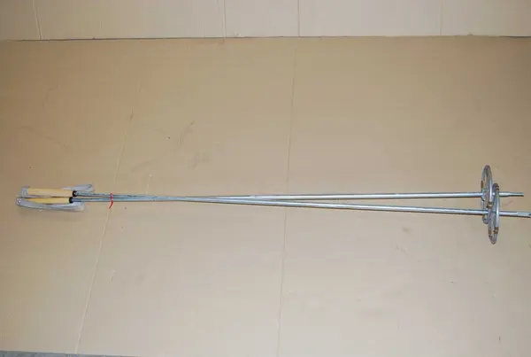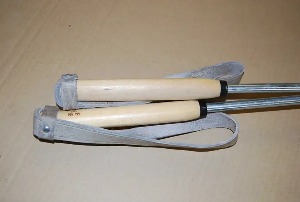 • Skidstavar av stål, 1 par. Av förzinkat stål med handtag av klarlackerat trä, försett med svart plåtring nertill. Kronstämpel samt märkning med V och H på vänster respektive höger handtag. Truga av stål med läderremmar, brodd med tvådelad spets.