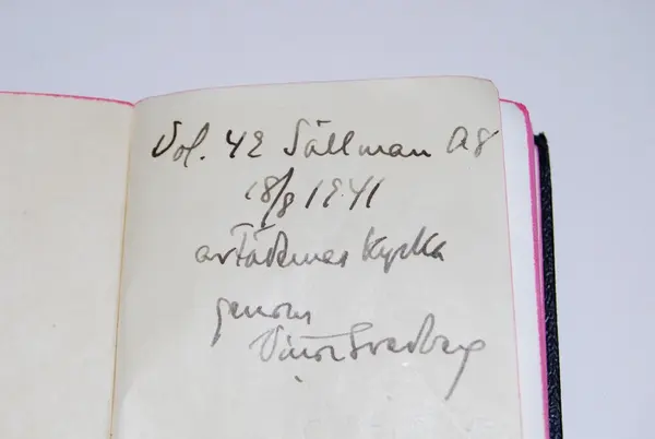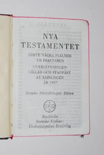 Tryckt 1941 och utgiven av SKD, Stockholm. Påskrift med bläck på försättsbladet: "Sol. 42 Sällman A8 18/8 1941 av Fädernes kyrka genom [oläsligt] Svedberg". Under detta en otydlig blekt påskrift "Christina Sällman[?] Tel 0920[?]-51105".