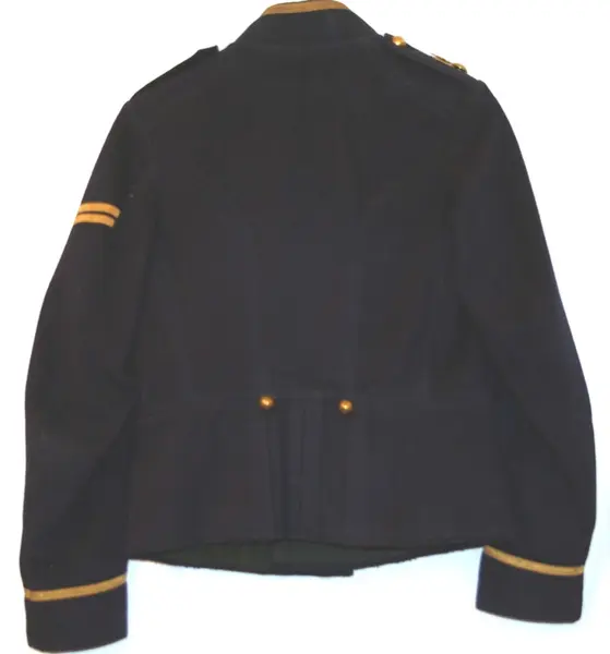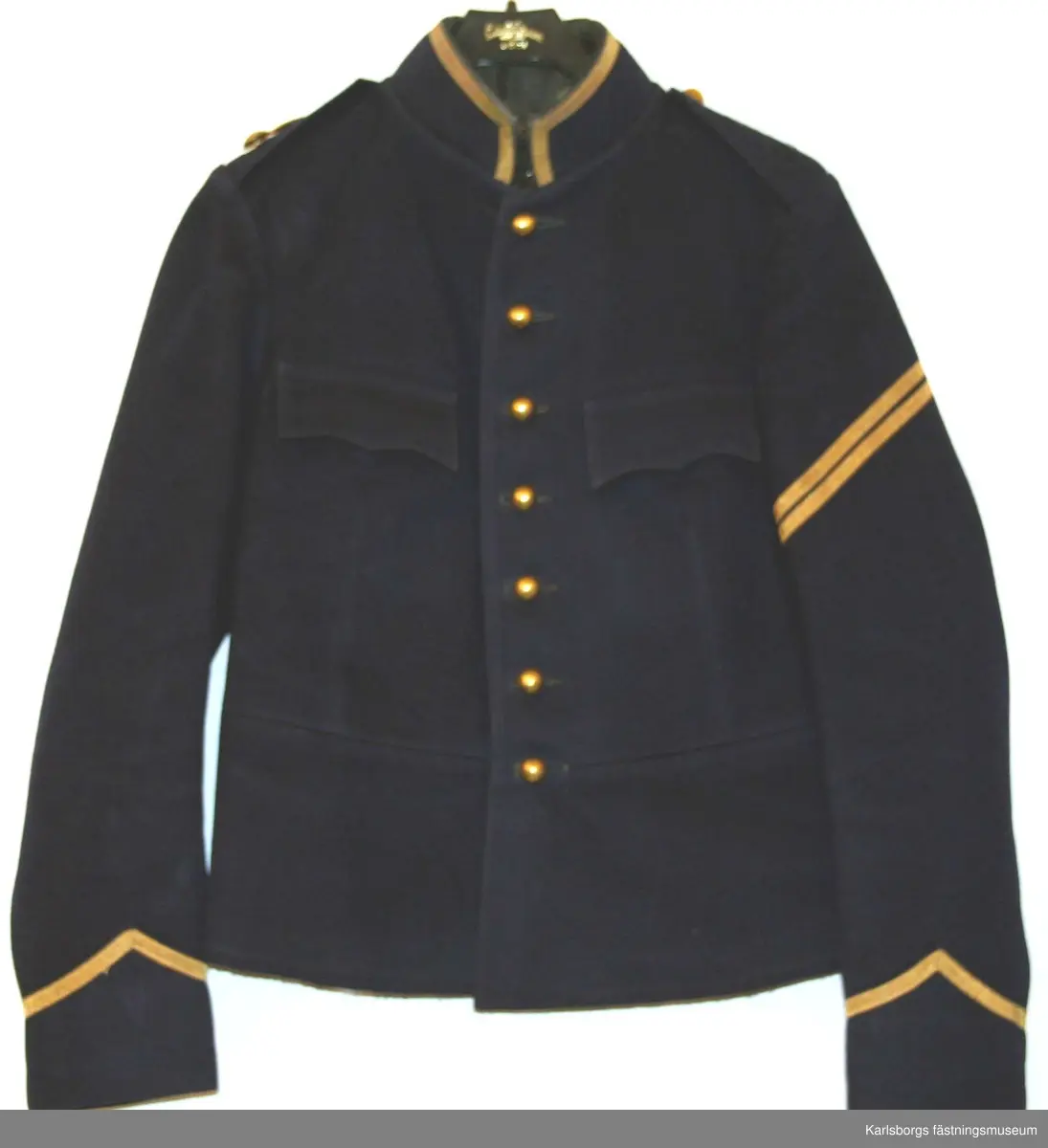 Kollett m/1872 - Furir, Artilleri - hög krage, fastsydda axelklaffar som knäpps med en slät knapp, artilleriets tecken i metall på axelklaff. Knäppes med 7 släta knappar i guldmetall, avskuren i midjan, två bröstfickor med lock, dubbelveck i bak med två knappar, halvt grått livfoder med två innefickor. Guldpasspoal runt kragen och runt ärmar, samt två skolstreck Underofficersskola på vänster ärm. Def. Ett tecken på en axel saknas. Märkt A9 1935.