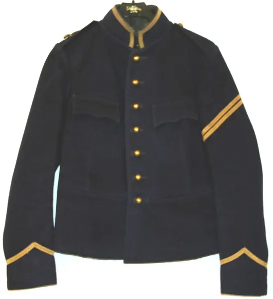 Kollett m/1872 - Furir, Artilleri - hög krage, fastsydda axelklaffar som knäpps med en slät knapp, artilleriets tecken i metall på axelklaff. Knäppes med 7 släta knappar i guldmetall, avskuren i midjan, två bröstfickor med lock, dubbelveck i bak med två knappar, halvt grått livfoder med två innefickor. Guldpasspoal runt kragen och runt ärmar, samt två skolstreck Underofficersskola på vänster ärm...