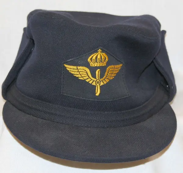 Storlek: 57Vintermössa flyg av mörkblått tyg, tygklädd skärm nedfällbart öronskydd, försedd med flygemblem Ubef.