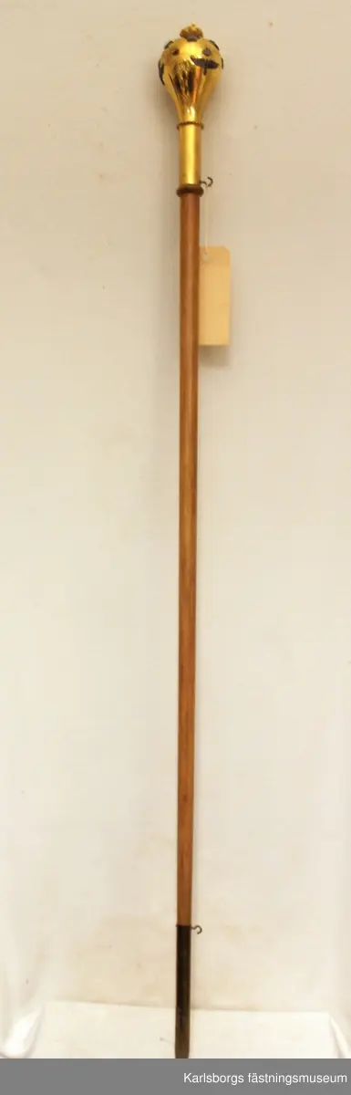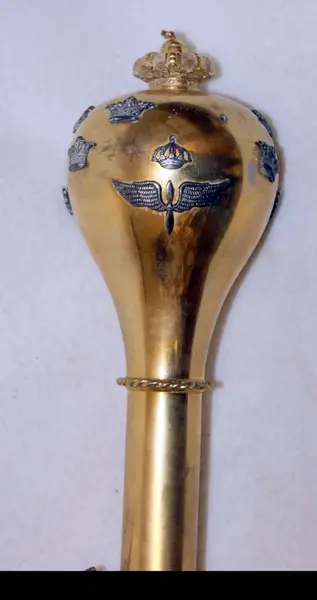 • Stav av trä, övre del i guldfärgad metall med kronor och flygemblem. Nedre delen klädd i guldfärgad metall. Används av marschmusiksledaren.