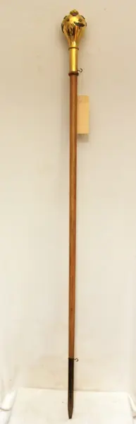 • Stav av trä, övre del i guldfärgad metall med kronor och flygemblem. Nedre delen klädd i guldfärgad metall. Används av marschmusiksledaren.
