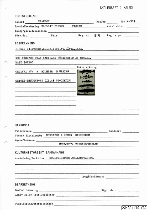 Fiskar III: Torsk, Kolja, Vitling, Långa, Lake. Med hängare utan kantband. Hörnskydd av metall. Orginal av: M Richter, B. Ursing. Tryckt: Bengtssons Lit. AB, Stockholm.