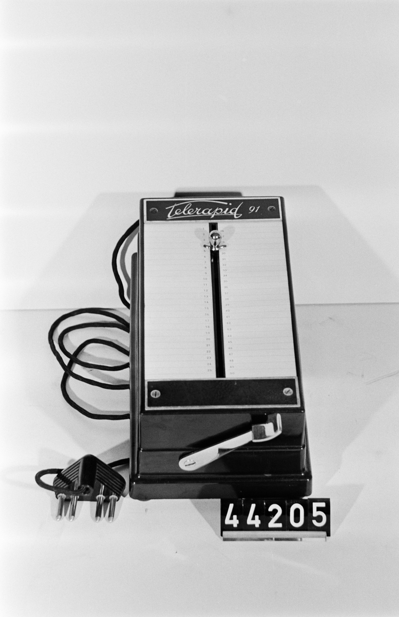 • Telerapid, bordsmodell av plast, för automatisk siffertagning vid massbeställning av samtal. Artikelnummer i Televerkets Materielkatalog: 00-56057.