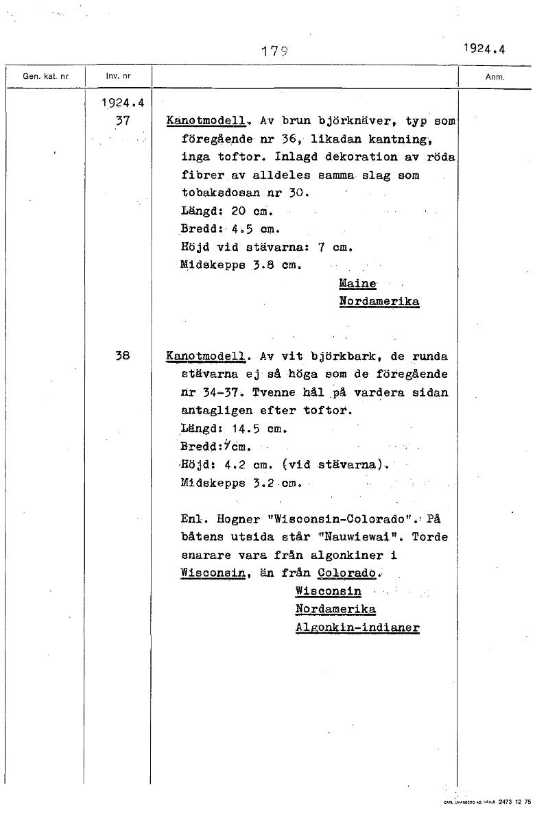 179 1924.4 1924.4 37 Kanotmodell. Av brun björknäver, typ som föregående nr 36, likadan kantning, inga toftor. Inlagd dekoration av .röda fibrer av alldeles samma slag som tobaksdosan nr 30. Längd: 20...