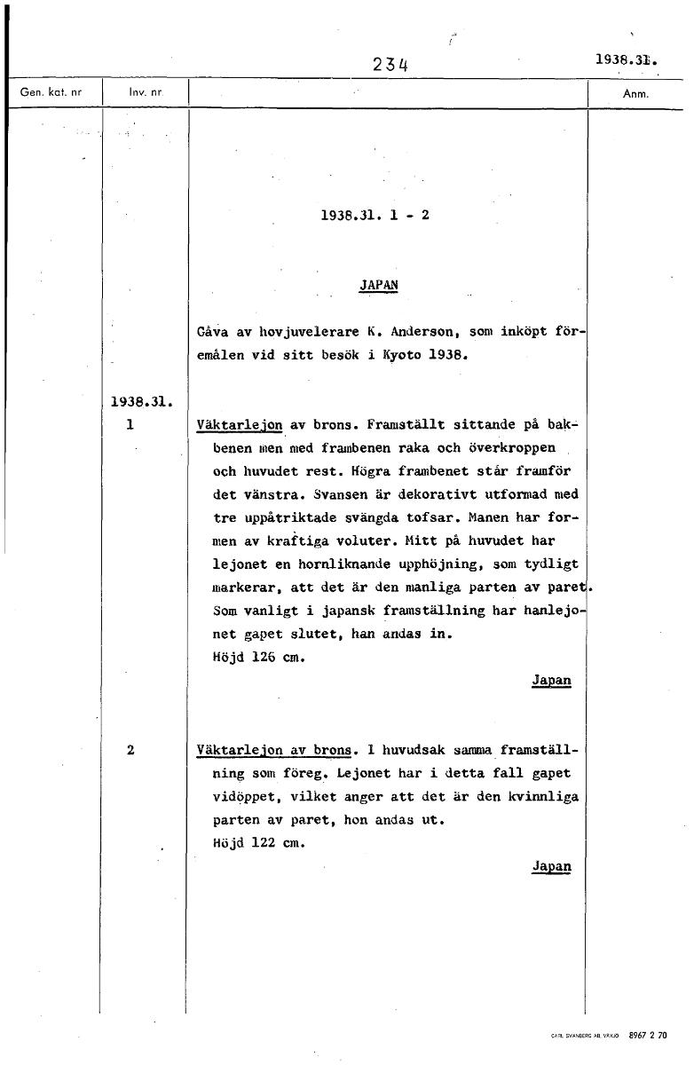 234 1938.31. 1938.31. 1 - 2 JAPAN Gåva av hovjuvelerare K. Anderson, som inköpt föremålen vid sitt besök i Kyoto 1938. 1938.31. 1 Väktarlejon av brons. Framställt sittande på bakbenen men med frambenen raka och överkroppen och huvudet rest. Högra frambenet står framför det vänstra. Svansen är dekorativt utformad med tre uppåtriktade svängda tofsar. Manen har formen av kraftiga voluter. Mitt på huvudet har lejonet en hornliknande upphöjning, som tydligt markerar, att det är den manliga parten av paret. Som vanligt i japansk framställning har hanlejonet gapet slutet, han andas in. Höjd 126 cm. Japan 2 Väktarlejon av brons. I huvudsak samma framställning som föreg. Lejonet har i detta fall gapet vidöppet, vilket anger att det är den kvinnliga parten av paret, hon andas ut. Höjd 122 cm. Japan [ocr]Stäng