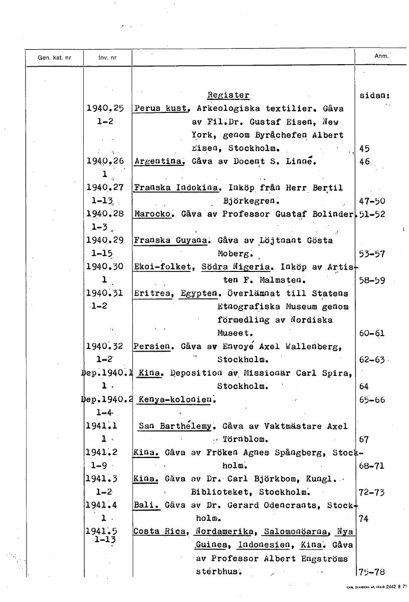 Register sidan: 1940.25 Perus kust, Arkeologiska textilier. Gåva 1-2 av Fil.Dr. Gustaf Eisen, New York, genom Byråchefen Albert Eisen, Stockholm. 45 1 94.p 26 Argentina. Gåva av Docent S. Linne. 46 1 1940.27 Franska Indokina. Inköp, från Herr Bertil Björkegren. 47-50 1940.28 Marocko. Gåva av Professor Gustaf Bolinder .51-52 ,1-3 1940.29 Franska Guyana. Gåva av Löjtnant Gösta 1-15. , Moberg:, 53-57 194.0.30 Ekoi-folket, Södra Nigeria. Inköp av,Artis ten F. Malmstea. 58-59 1940.31 Eritrea, Egypten. överlämnat till Statens -1-2 Etnografiska Museum genom förmedling av Nordiska Museet. 60-61 1940.32 Persien. Gåva av Envoye Axel Wallenberg, 1-2' Stockholm. 62-63. ep.1940.4 Kina. veposition av. Missionär Carl Spira 1 • Stockholm. 64 ep.1940.2 Kenya-kolonien: 65-66 1941.1 San Barthelemy. Gåva av Vaktmästare Axel 1. Törnblom. 67 1941.2 Kina. Gåva av Fröken Agnes Spångberg, Stoc 1-9 holm: 68-71 1941.3 Kina. Gåva av Dr. Carl Björkbom, Kungl. Biblioteket, Stockholm. 72-73 1941.4 Bali. Gåva av Dr. Gerard Odencrants, Stock 1 holm. 4 1941.5 Costa Rica Nordamerika, Salomonöarna, Nya 1-13 ,Guinea, Indonesien, Kina. Gåva av Professor Albert Engströms sterbhus. 75-78 [ocr]