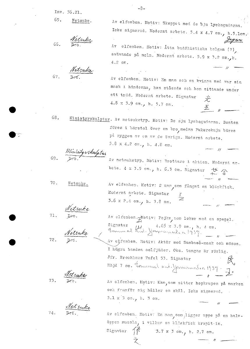 -8-- Inv. 36.21. 65. Netsake. Av elfenben. Motiv: Skeppet med de 'sju lyckogudarna. Icke signerad. Modernt arbete. 5.4 x 4.7 cm. h 5 lcm Av elfenben. Motiv: åtta buddhistiska helgon (?) / svävande på moln. Modernt arbete. 5.9 x 3.2 em./h. 4.2 cm. g-Y,31y 67. Av elfenben. Motiv: En man och en kvinna med var sin mask i händerna han stående och hon sittande under ett träd. Modernt arbete. Signatur 4.8 x 3.9 cm./ h. 5.7 cm. P 68, Miniatyrskulptur. Av netsuketyp. Motiv: De sju lyekogudarna. Benten föres i bärstol över en bro medan Pukurokuju bäres på ryggen av en av de övriga. Modernt arbete. 5.8 x 4.2 cm h. 4 8 cm 44, 69. Av netsuketyp. Motiv: Brottare i aktion. Modernt ar- bete. 4 x 3.5 cm.) h. 6.3 cm. Signatur 4,-9- 70. Netsnke Av elfenben. Motiv: 2 man som fångat en bläckfisk. Modernt arbete, Signatur 3.6 x 2.4 cm.? h. 3.8 cm. Av elfenben. Motiv: Pojke som leker med en spegel. Signatur 4.65 x 3.9 cm. y 72. 91k,rt Av elfenben. Motiv: Aktör med Sambas-å-mask och mössa. I högra handen solfjäder. Obs. tungan är rörlig. Jfr. Brockhaus Tafel 53. Signatur Höjd 7 cm. cLek-,,AkA,_,,c,.., 73. . Av elfenben. Motiv: Man som sitter hopkrupen på marken och :äramför sig håller en skål. Icke signerad. 3.1 x 3 cm h. 3 cm. Av elfenben. Motiv: En mun / som ,ligger uppe på en halv- öppen mussla/ i vilken en bl.;,'.kfisk krupit•in. Signatur i • 3.7 x 3 cm., h. ? 7 cm. [ocr]