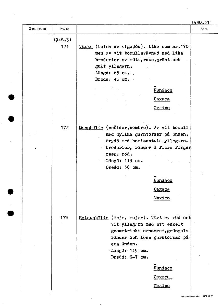 1948.31' 1948.31 171 Väska (bolsa de algod6n). Lika som nr.170 men av vit bomullsvävnad med lika broderier av rötterosatgrönt och gult yllegern. Längd: 63 cm. Bredd: 40 cm. y Nundaco Oaxacs Mexico 172...Visa hela