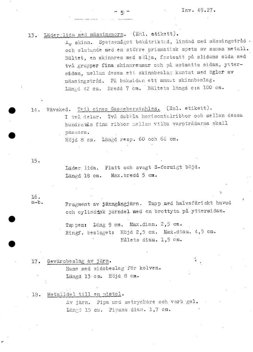 5 Inv. 49.27. 13.• Läder.:,lida med mässinsorn. (E;;i1. etikett). skinn. Suetsenågot bakåtriktLd, lindad med aässingstråd och slutande med en större prismatisk spets av samma metall. Bältet, en skinnrem med sölja, fastsatt på slidans sida med två grupper fina skinnrennar och på motsatta sidan, ytter- sidan, nellan dessa ett skirmbeslaa kantat med öglor av mässingstråd. På baksidan ett annat skinnbeslag. Länd 42 cm. Bredd 7 cm. 'Bältets längd c:a 100 cm. • 14. Vävsked. Teil eines Gas:,eb,:rstuhles. (Enl. etikett). 1 två delar. Två dubhla horisontalribbor och mellan dessa hundras fina ribbor vilka varutrådarna skall • passera. Höjd 8 on. Längd resp. 60 och 6u cm. Läder. lida. Platt och svagt S-formigt böjd. Längd 18 cm. Max.bredd 5 cm. a-b. Fragment av jännghgjärn. Tapp ned halvsfäri skt huvud och cylind4sk järndel med en brottyta på. yttersidan. Tappen: Lang 9 cm. Max.diam. 2,5 cm. Ring f. beslaget : Höjd 2,5 clu.. Max.diaf.I. 4,5 cm. Hålets dian. 1,5 cm. 17. Gevärsbeslag av järn. Hane med sidobeslag för kolven. Längd 13 on. Höjd 8 cm. • 18. Metalidel till en Av järn. Pipa med avtryckare och verb gol, Län 15 cl-J- Pians diam. 1,7 cm. [ocr]
