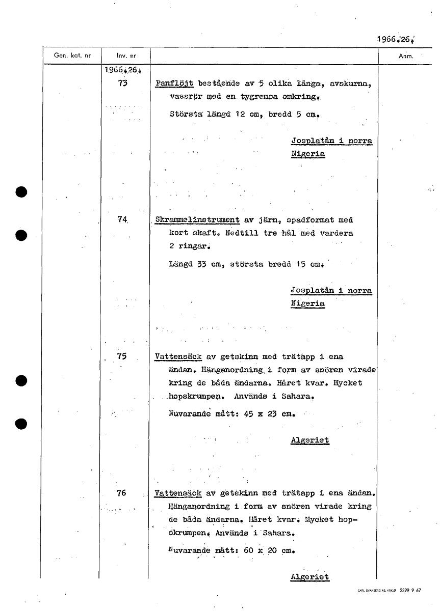 1966.'26." 19664,264 73 Par_,gliL3t bestående av 5 olika långa, avskurna, vassrör med en tygramsa omkring.. Största längd 12 cm4,bredd 5 cm... norra 214eria 74 Skrammelinstrument av järn, spadformat m...