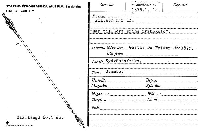STATENS ETNOGRAFISKA MUSEUM, Stockholm ETNOGR. .4:14,fkkEer.' Max.längd 60,5 cm. 4- ELANDERS.GOG.31379.1" Gen. n:r —.Sam1.-n:r -., ' 1875.1. 14. Dep. n:r Föremål: Pil,som n:r 13. "Har tillhört prins Tyikokoto". /7~11, Gåva av: GuQtav De Wylder A1175_ Köp från: Lokal: Sydvästafrika. . • Stam: Ovambo. Utstå»: Magasin: I Depon: I Byte till: Negat. n:r Bild n:r Skiopt. „ Kliché,, Publ. [ocr]