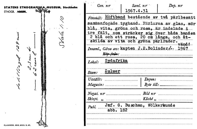 STATENS ETNOGRAF MUSEUM, Stockholm ETNOGR. 9a, j N ELANDERS. GBG. B503. 5.65. Gen. n:r _... _...... ... ._ I Saml. n:r' ' I 1967.4.31 I I Dep. n:r Höftband bestående .Fi,;:eriku: av två pärlbesat P.ärlorna .av glas., mö ro.sa., är .ind.elade i sig över båda band.e 20 cm långa, och åt- pårlrader. vändi...- E , Boinaerir: ....19..7...... ..samManfogiad.e tyg.band. ..blå.., vita, gröna. .oc.h. tre fält, som sträcker 2 blå och ett rosa, skilda av vita och gröna InsamL, Gåva av: kapten J. ii~: Lokal: Zuluer Stam: 0.01«1«....■ Utstå/it: Magasin: i Depon: I Byte till: Negat. n:r Bild n:r Skiopt. „ Kliché,, Publ. Jmf. . G. Bu sc han, Wö lke rkund e abb. 182 t r n [ocr]