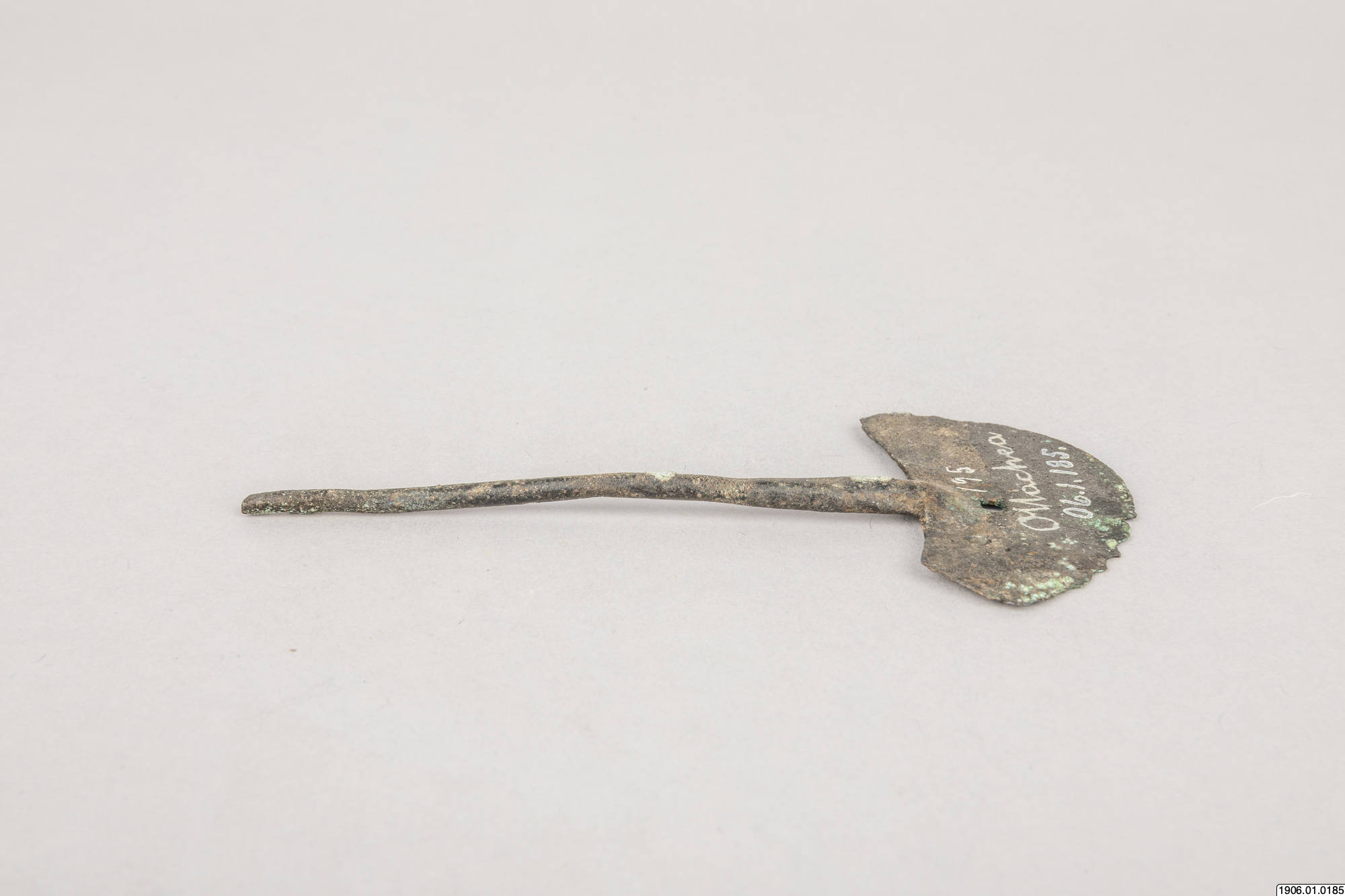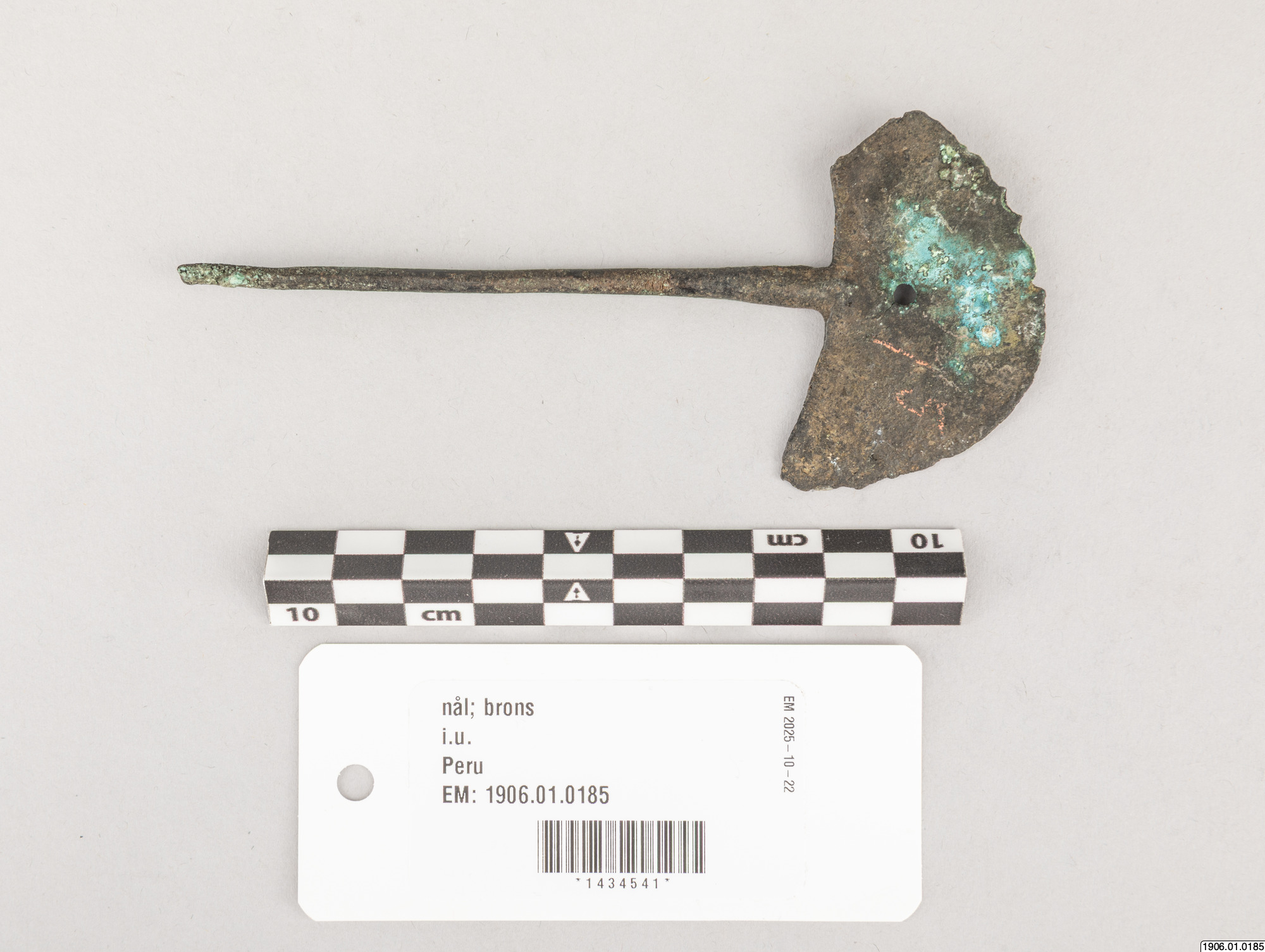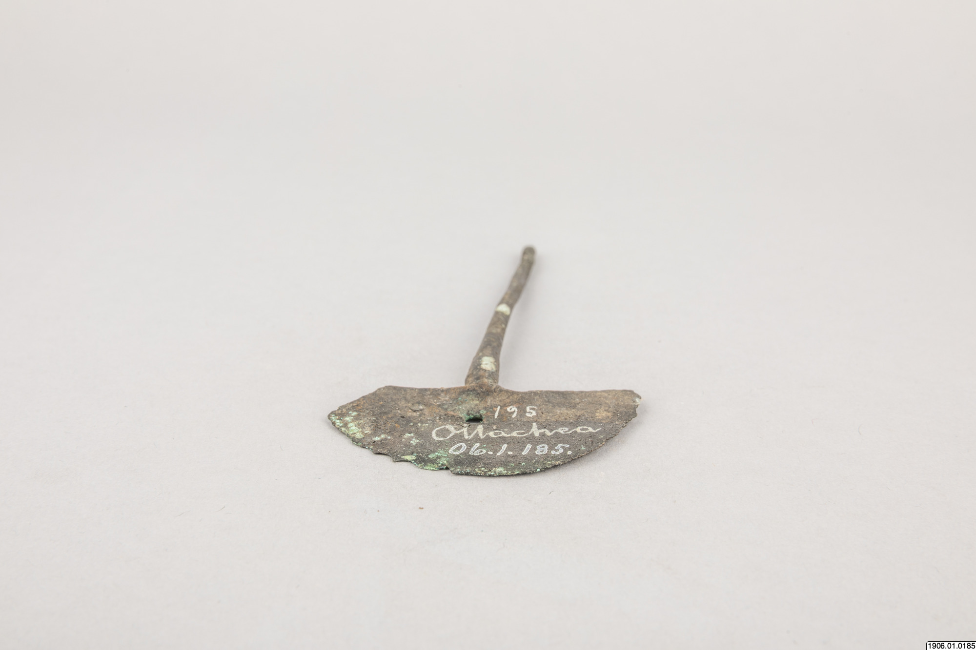 222.•Borrat hål i huvudet. HUvudet något trasigt. Längd: 12,3 cm. Huvudets bredd: 2,8 cm. Avbildad Nordenskiöld 1906, tavla 2:13. 011achea Peru [ocr]
