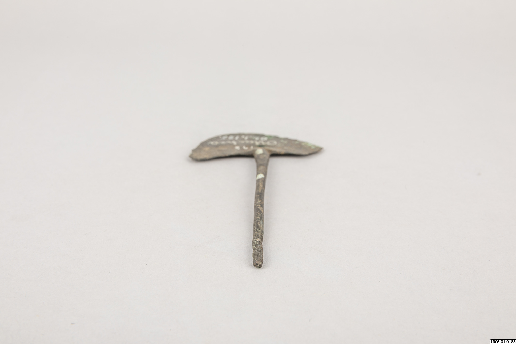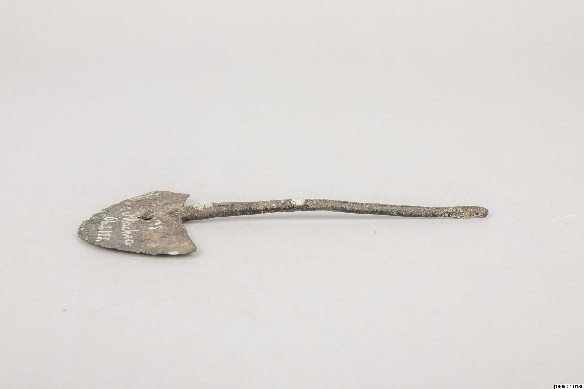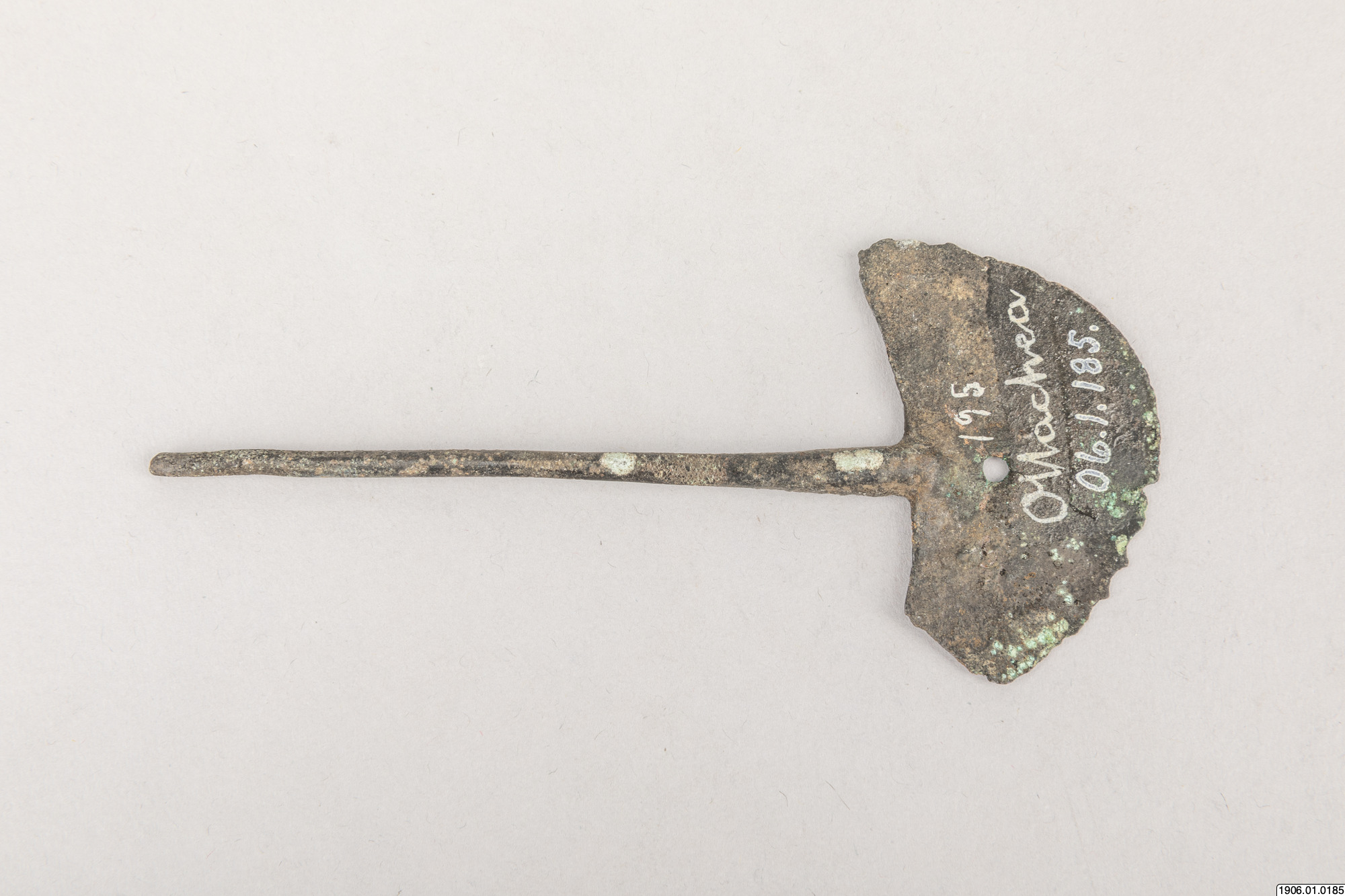 222.•Borrat hål i huvudet. HUvudet något trasigt. Längd: 12,3 cm. Huvudets bredd: 2,8 cm. Avbildad Nordenskiöld 1906, tavla 2:13. 011achea Peru [ocr]