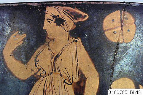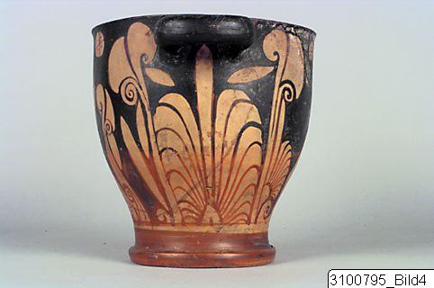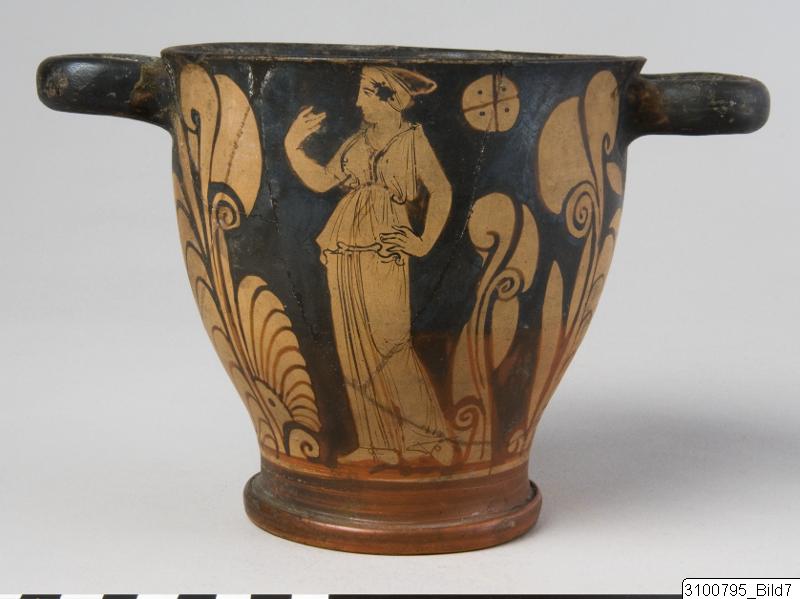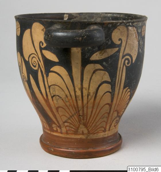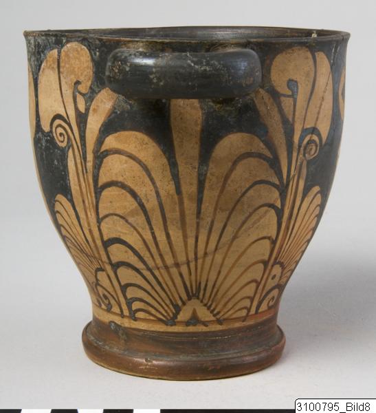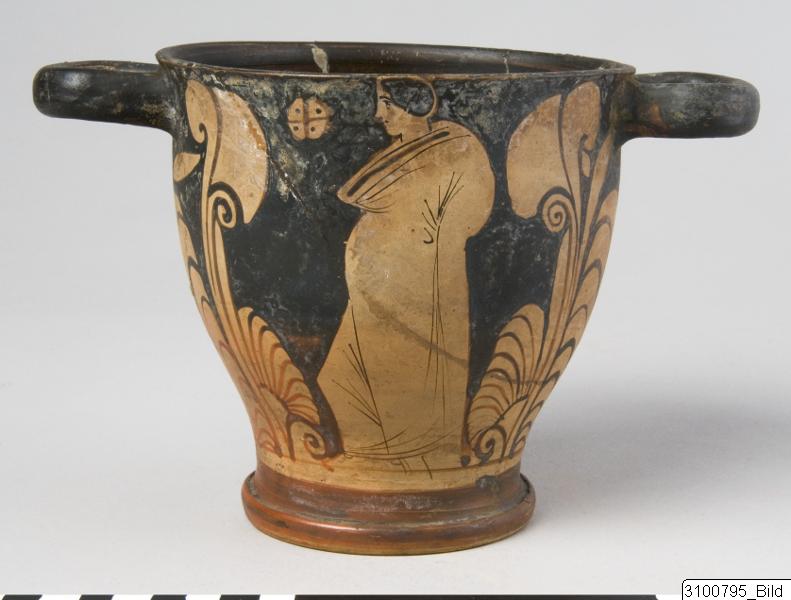 Everted rim; deep body with heavy wall; thick, horizontal bell shaped handles beneath rim; groove at junction between body and base; wide ring base. Yellowish brown clay; black glaze, partly misfired to red and brown. On one side of body a standing woman wearing a chiton, a fillet and shoes, holding her left hand on her hip; on the opposite side a standing youth, wearing a himation – in the upper field to the right a quadrated and dotted disc; on both sides the figures are flanked by large flowers and palmette fans; palmettes and leaves beneath handles; a band on inner side of base.