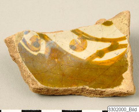 • Fragment of possibly a bowl. Part of ring-base. Interior and exterior of bowl decoarted in light green, yellowish on white background. Light buff, pinkish clay.