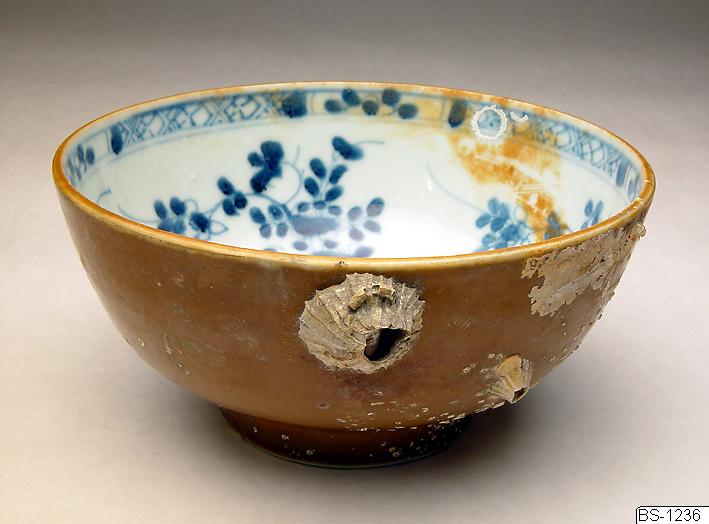 Skål i porslin med blomdekor i underglasyrblått. Utsidan har kapucinerbrun glasyr. Havstulpaner främst på utsidan. Vattenfynd. I utställningen "Mittens rike" har skålen placerats tillsammans med fatet BS-1234.