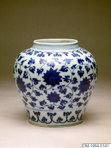 Kruka med dekor av lotusrankor i underglasyrblått. Höjd: 16 cm Diam: ca.16,5 cm Från Japansalen, glasrummet.Ursprungligen från Tang-Ming.