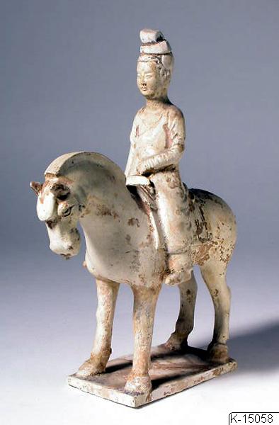 Man till häst. Ljust lergods med spår av glasyr. Från Tang-Ming, underskåp monter 7. Höjd: 28,5 cm Längd: ca.23 cm Bredd: 10 cm