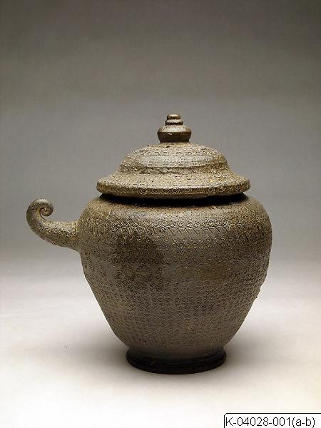The object consists of a round container on a foot and a domed lid with a rounded, three-tiered knob (also called a jewel-shaped knob). The lid is held in place by a rim on the container matching a groove on the lid. A curled handle was attached to the body on one side. Almost the entire surface, even parts of the handle, is covered with geometric patterns that were impressed onto the clay surface with stamps. The decorative motifs of various shapes include bands of flowers, a key-hole shaped pattern and dense rows of double-circles. An incidental, natural ash-glaze covers parts of the urn which gives the surface a shine and an overall dark greenish-grey tone. The wall blistered up in several locations. Four holes were pierced equidistant around the knob on the lid. Their function is unclear. This is a typical example of urns used for holding the ashes of the deceased after cremation during the middle period of Unified Silla (668-935). Cremation was introduced to the Silla kingdom through the Buddhist religion and was adopted as a common practice during the Unified Silla period when Buddhism flourished. The crowded geometric patterns achieved by impressing the leather-hard clay surface with a stamp are characteristic for these type of vessels.