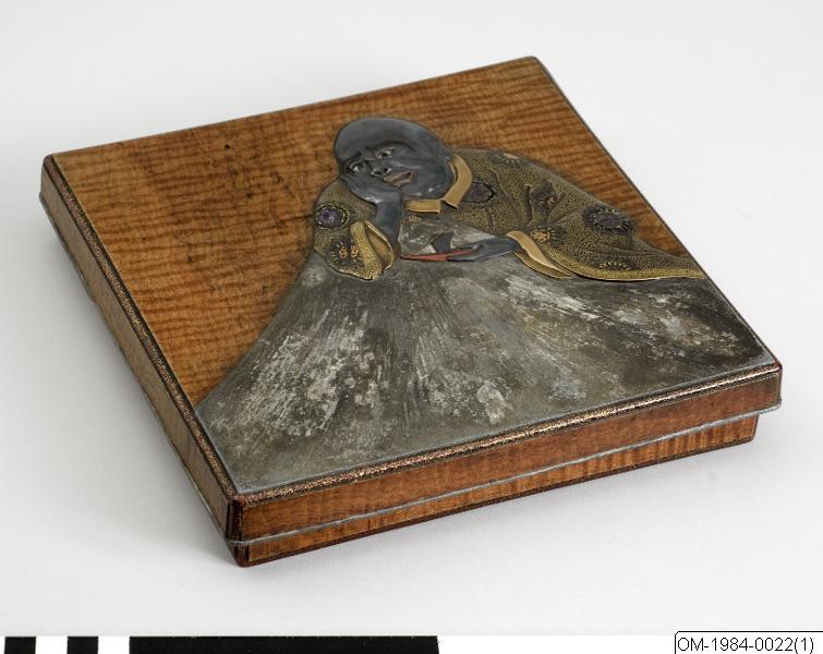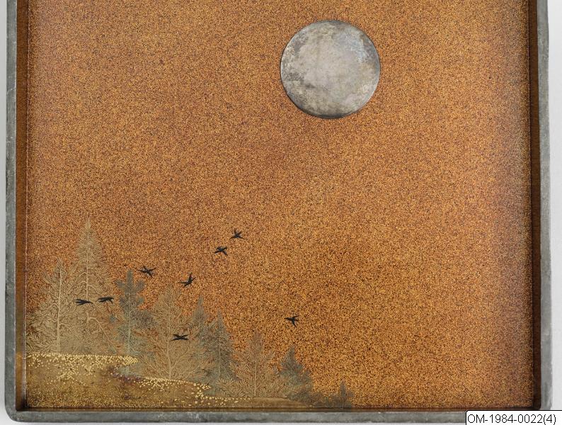 Nashi-ji täcker insidan (både lock och box) samt boxens undersida. På lockets insida även dekor i guldlack av ett skogsmotiv med piparfåglar samt en måne i oxiderat silver.