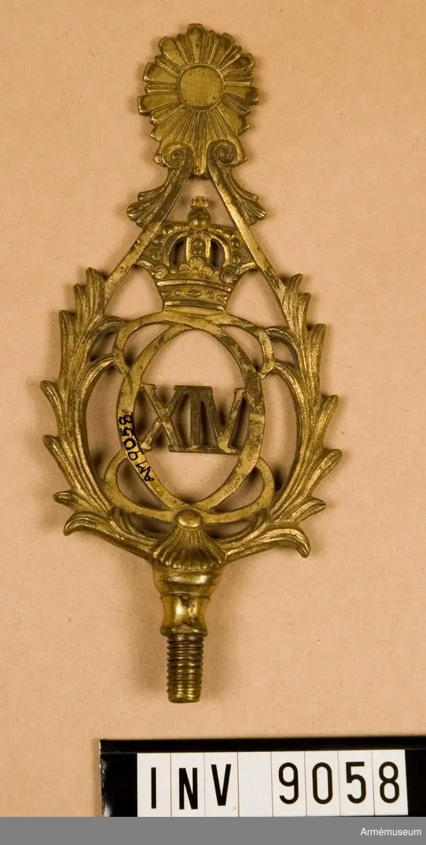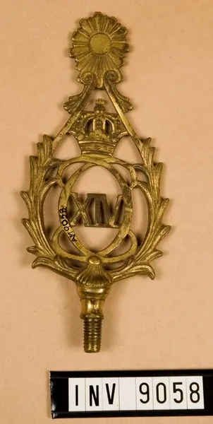 • Av förgylld metall ned konungens namnchiffer C XIV J omgivet av bladkrans i spetsform.