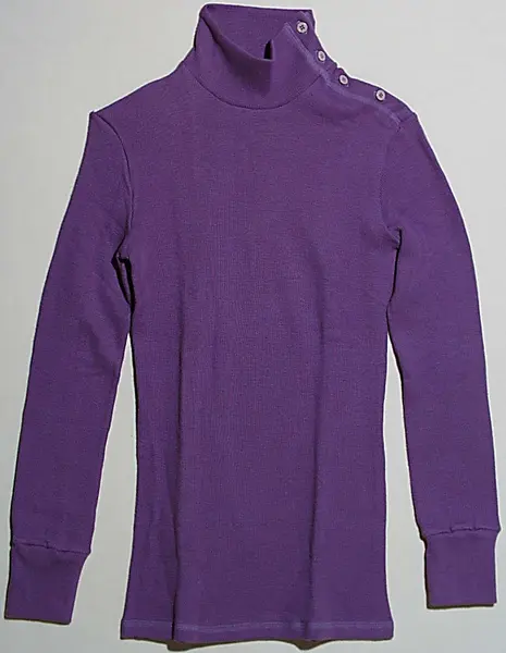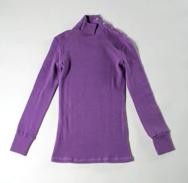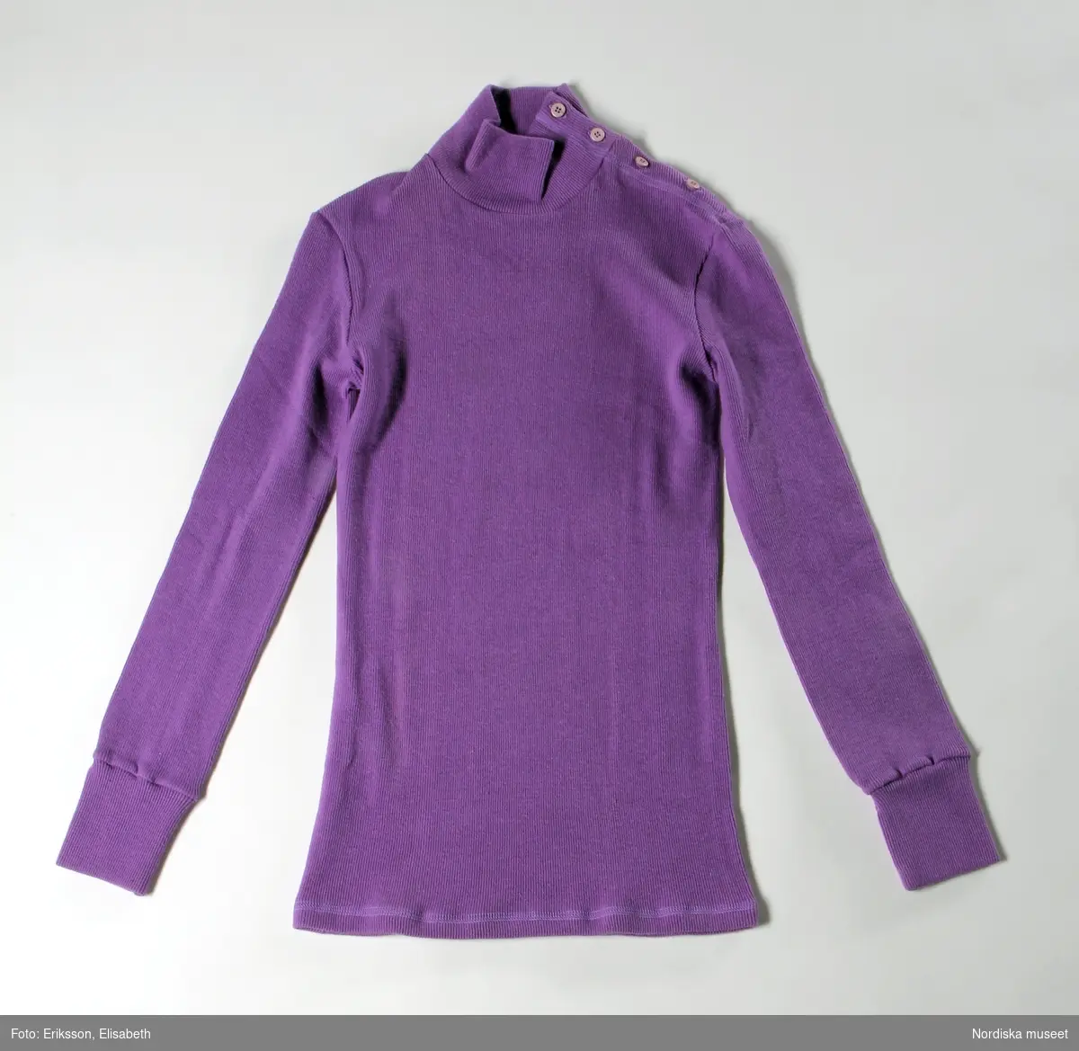 Katalogkort Sakord: TRÖJA specialbenämning: Lahmanströja material: bomulltrikå teknik: maskinsömnad tillverkningstid: 1968 - tillverkningsort: Sverige tillverkare: Mah-Jong AB mått: längd, 71 cm ärmlängd: 47 cm kraghöjd: 7,5 cm stl: small av ljust violett ribbstickad bomullstrikå, s.k. Lahmanstrikå 1 fram- och 1 bakstycke, isydd lång ärm med mudd, polokrage med knäppning på vänster axel med 4 knappar och knapphål. Mah-Jong var de första som återupptog Lahmanstrikån i vuxenkläder. Anna-Modeller hade haft det tidigare i spädbarnskläder. Mah-Jongs första plagg [i lahmantrikå] kom 1968 och trikån färgades i olika färger och användes till tröjor och långbyxor och västar. Blev en storsäljare. Under 1970-t. blev det mode och andra tillverkare följde efter. Inspirationen för Mah-Jong var gamla undertröjor i Arbetarbodar, materialet kändes mjukt och skönt och man undersökte var man kunde få fram det. Ingår i en samling representativa plagg ur Mah-Jongs kollektioner inv.nr. 313.587 313.630 samt affischer, modefoton m.m. arkiv nr. ? Pärmar m. skisser 313.631 313.632. Uppgifter se bilaga Berit Eldvik april -83. Bil. [svartvitt foto på katalogkort] Gåva 1983-03-01 av Veronica Nygren o Kristina Torsson, Sthlm