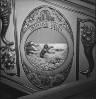 Vid den igenmurade, stickbågiga muröppningen till gravvalvet under Eriksbergskoret sitter utåtgående, svartmålade järnluckor. Nedgången till pannrummet är utförd med en gjuten betongsarg, vilken täcks av lucka av korrugerad plåt.