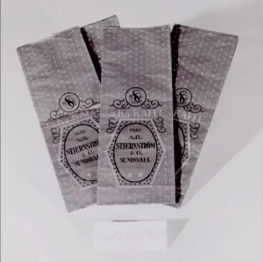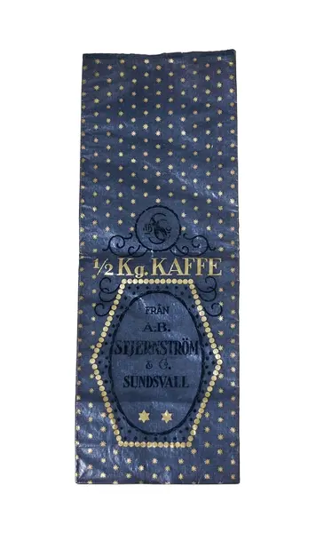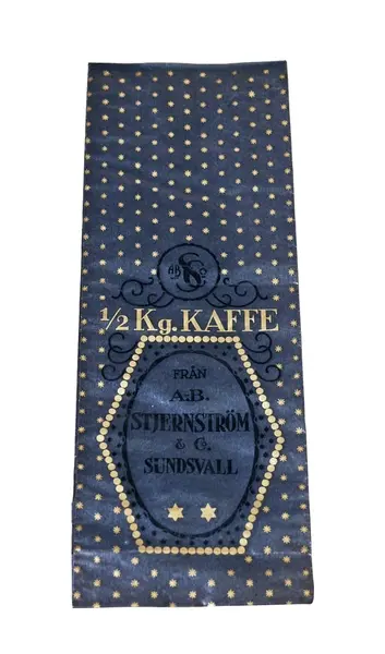 SuM 4999:1-4 fyra kaffepåsar tillverkade i blått papper med text och dekorationer i mörkblått och guld. Påsen är fodrad med ljust papper. Texten på påsen lyder '1/2 Kg. KAFFE FRÅN A.-B. STJERNSTRÖM & Co SUNDSVALL'.