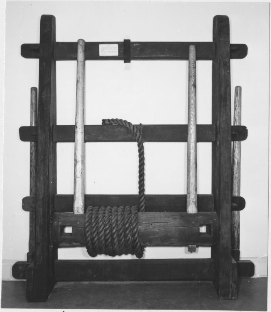 Består av två triangelformade sidostycken, sammanhållna av fyra tvärbalkar. Mellan sidostyckenas nedre del är en vals med trätappar lagrad. Dess båda ändar är förstärkta med en järnring, varav ena ringen försedd med en kuggkrans.
