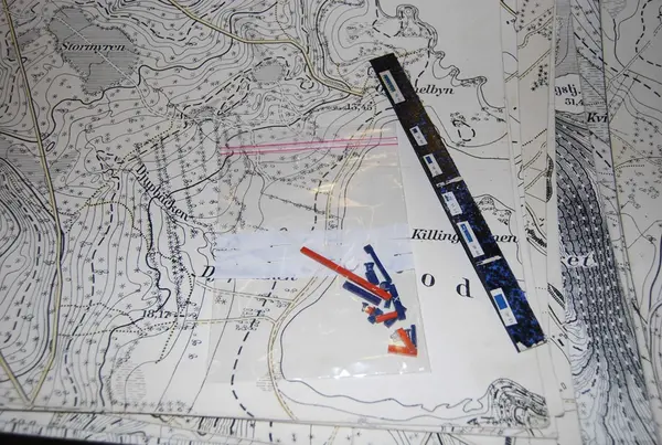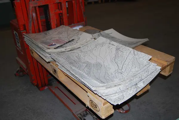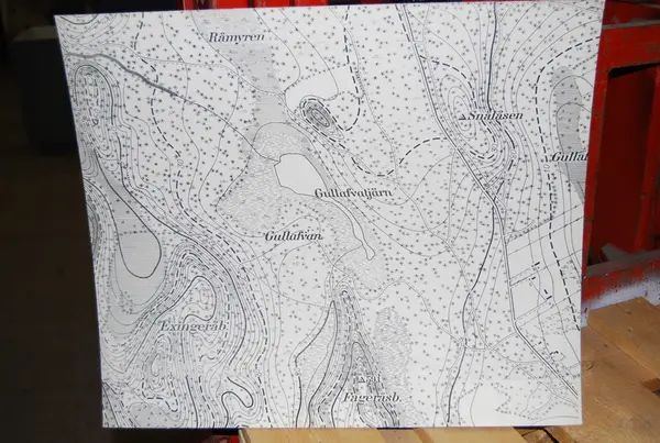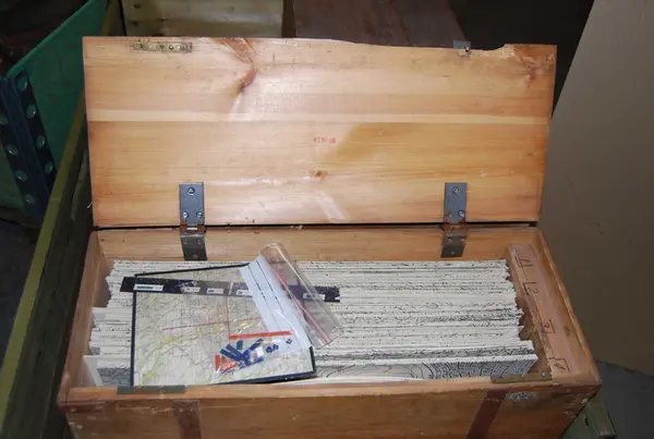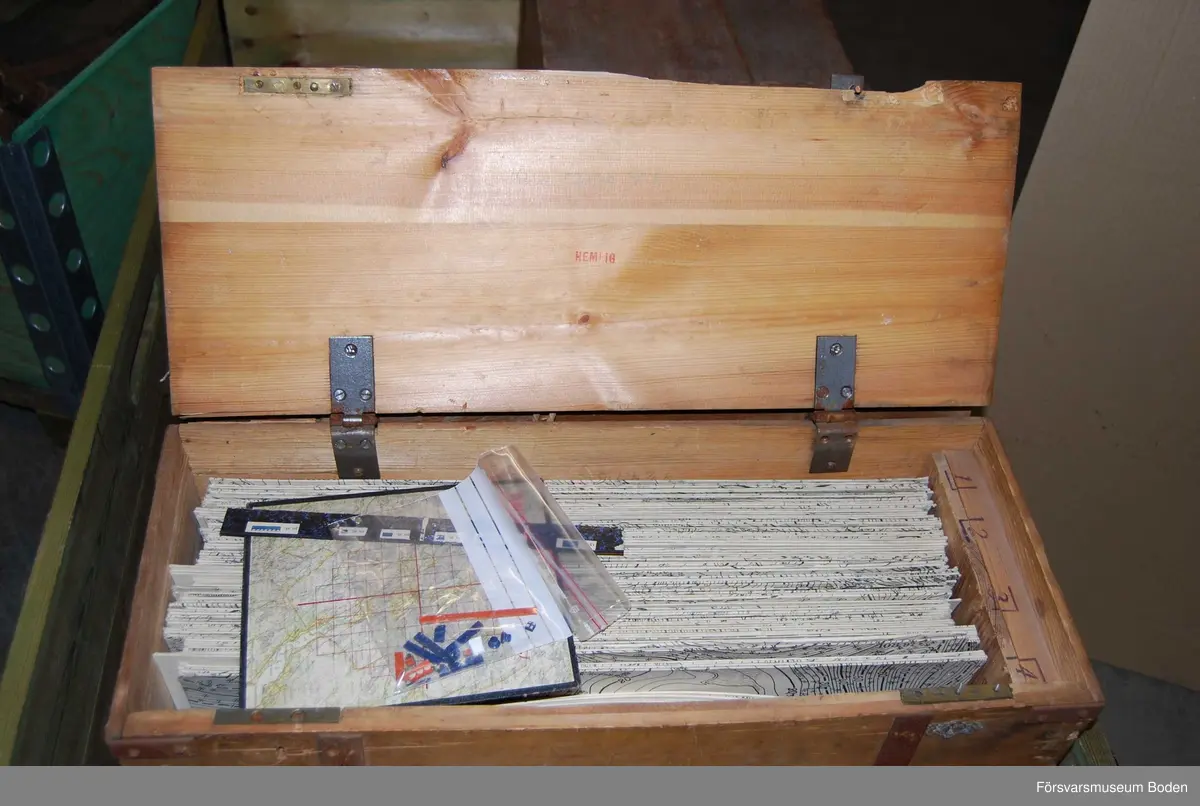 Trälåda innehållande kartblad på styv kartong över Boden och dess omgivningar, samt översiktskarta. Okänd skala men troligen 1:5000. Några lösa spelpjäser fanns på lådans botten. Trälådans lock försedd med lås, men nyckel saknas.