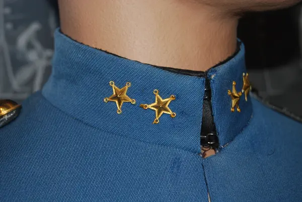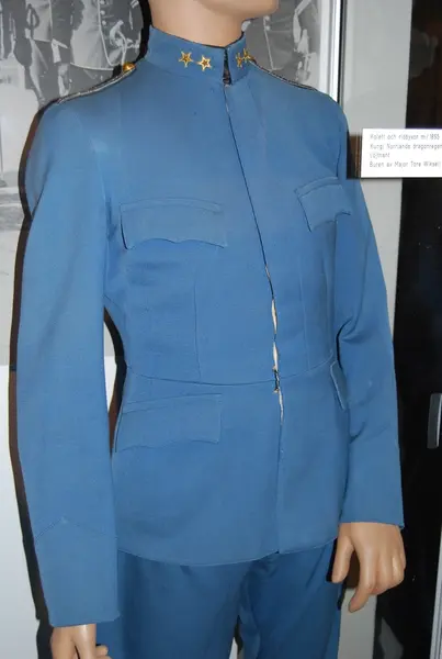 Mellanblå med krage i samma färg försedd med två stjärnor betecknande löjtnant. Framtill dold knäppning med 7 knappar i enkel rad. Axeltränsar m/1871 av dubbla silverfärgade fyrkantsgaloner med knappar av regementets modell.