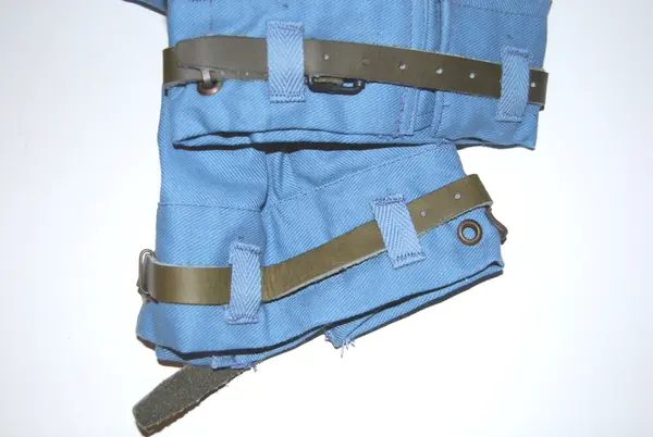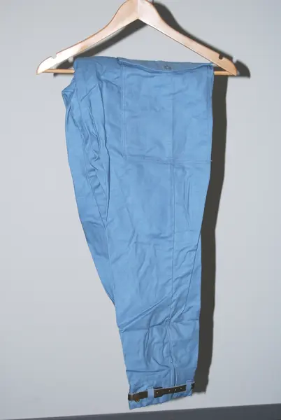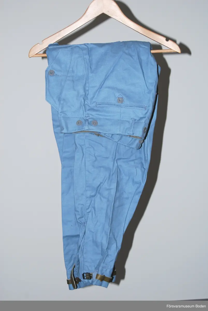 Ljusblått bomullstyg med remmar längst ner på benen. Hällor för bälte och gylf med fem knappar av grå plast. Två snedställda sidofickor, två benfickor samt en bakficka, samtliga med knappar. Bakfickan har ej lock, endast slejf. Storlek D104.
