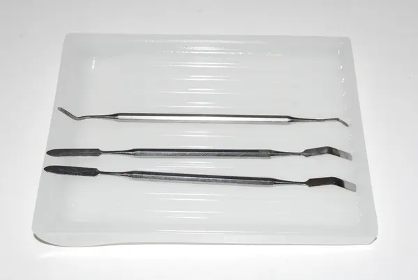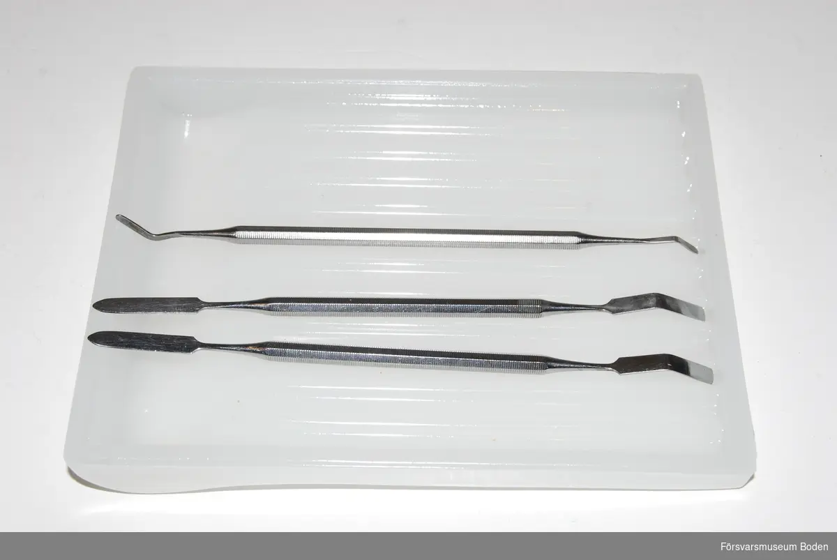 • Tre instrument av rostfritt stål i tråg av opalglas.
