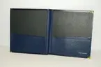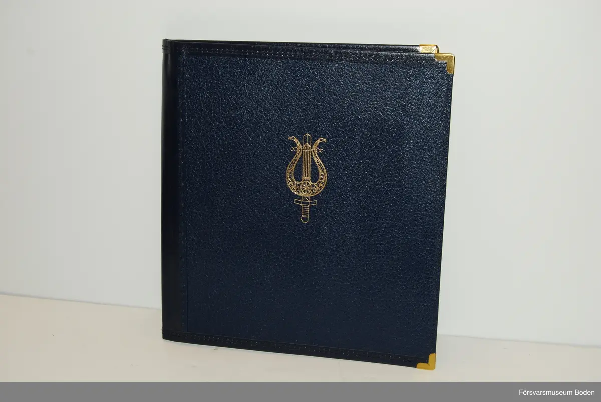 Av papp klädd med mörkblått konstläder och med mässingsskodda hörn. Musikkårens vapen i guldtryck på framsidan. Inuti finns fickor med bälg för notbladen. Tillverkad eller importerad av Sparta System AB i Fiskebäckskil/Lysekil.
