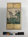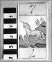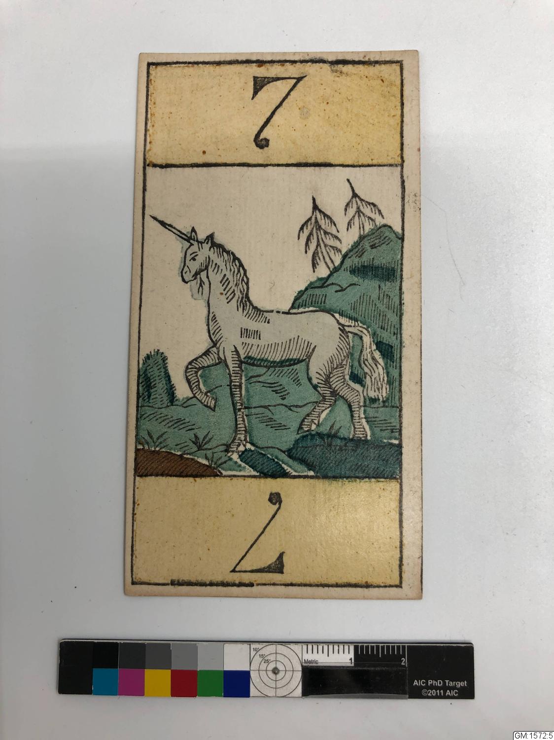 :5 Tarock-kort. Föreställande en enhörning. Kortet har nummer "7" skrivet över och under figuren. Kortet gjort i träsnitt och är handkolorerat; schablonerade franska svitmärken. Mönster i ljusblå prickrosetter på baksidan. Ingen tillverkare angiven. Ingen hallstämpel.