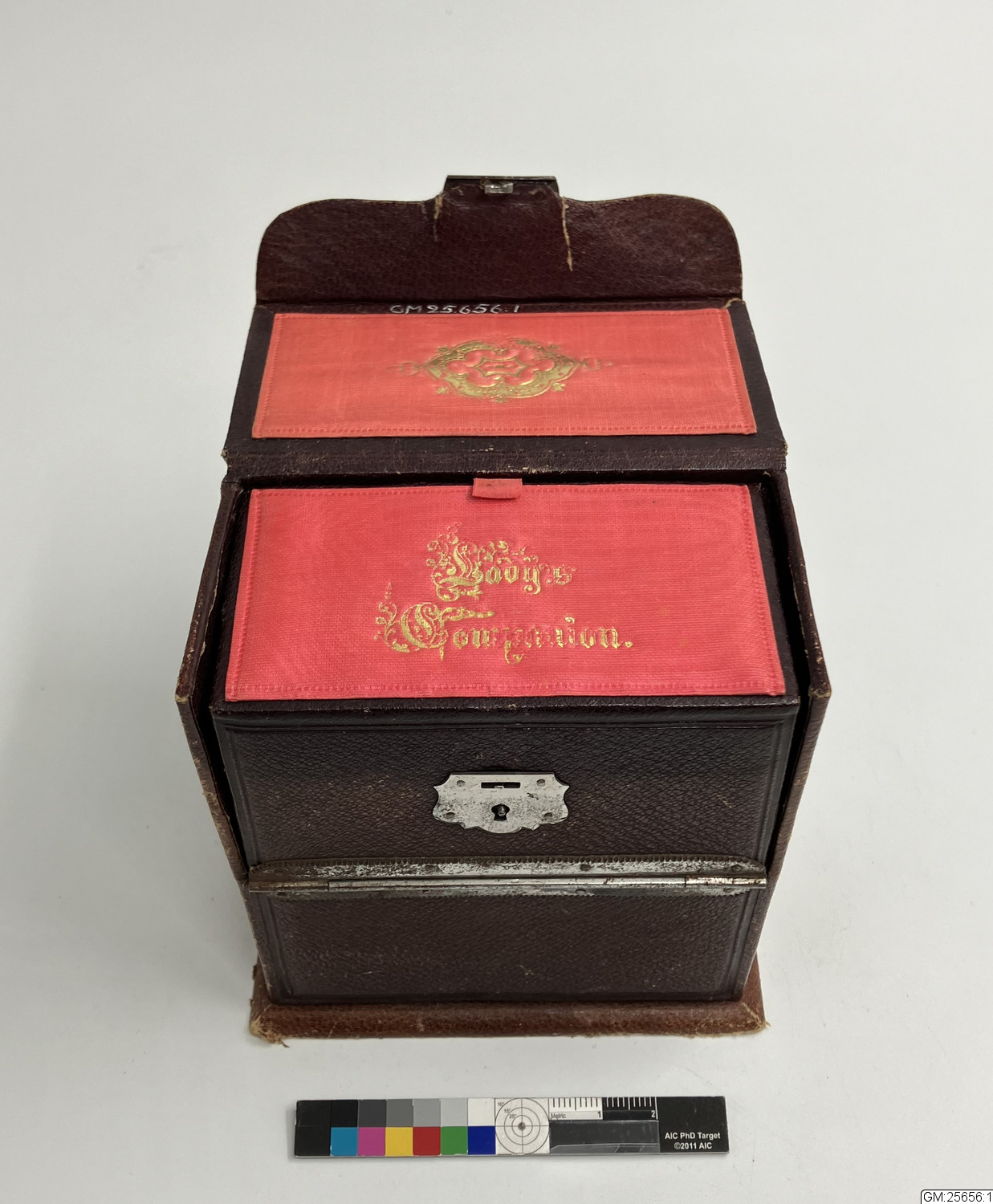 • "Ladys companion" med syredskap m.m. av papp och trä, klädd med brun pergammoid, fodrat med röd moiré och sammet.
