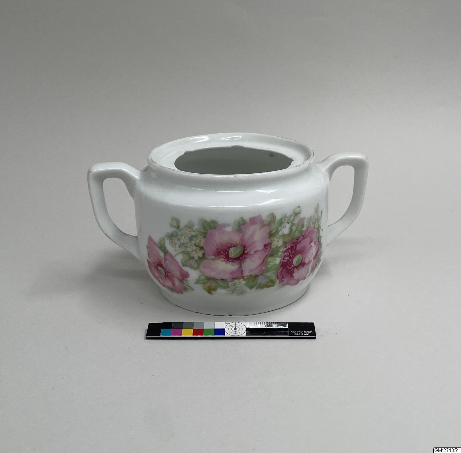 • Sockerskål (:1) med tillhörande lock (:2) och gräddkanna (:3). Rak modell med två öron, lock med handtag. Blomdekor i rosa och grönt.