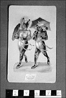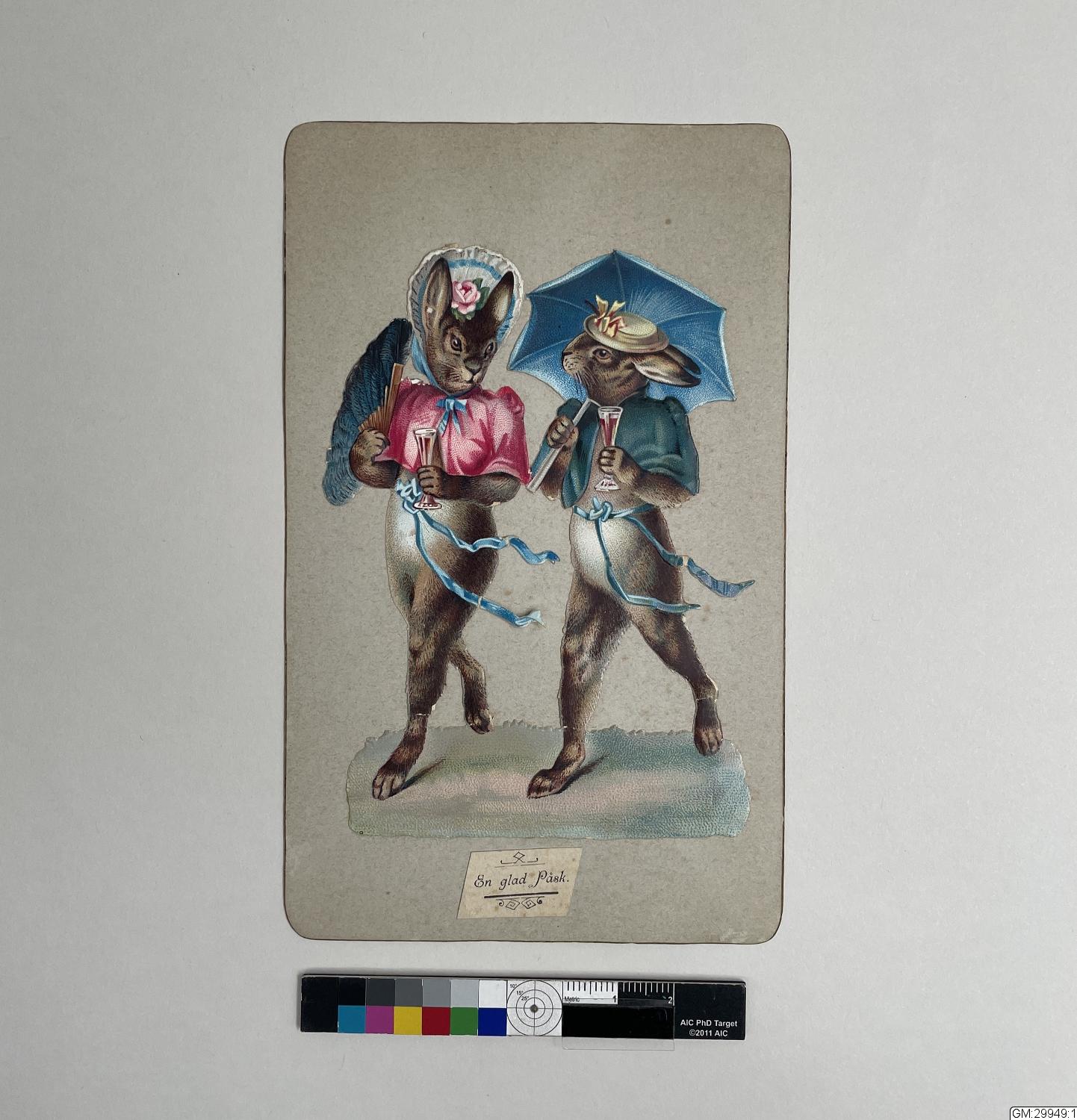Av papp och papper. Kort med påklistrat bokmärke med två harar av hon och hankön med var sitt champangeglas, polykrom bild. Under en lapp "En glad Påsk" och dekorationsslingor. Förgyllda kanter.