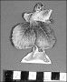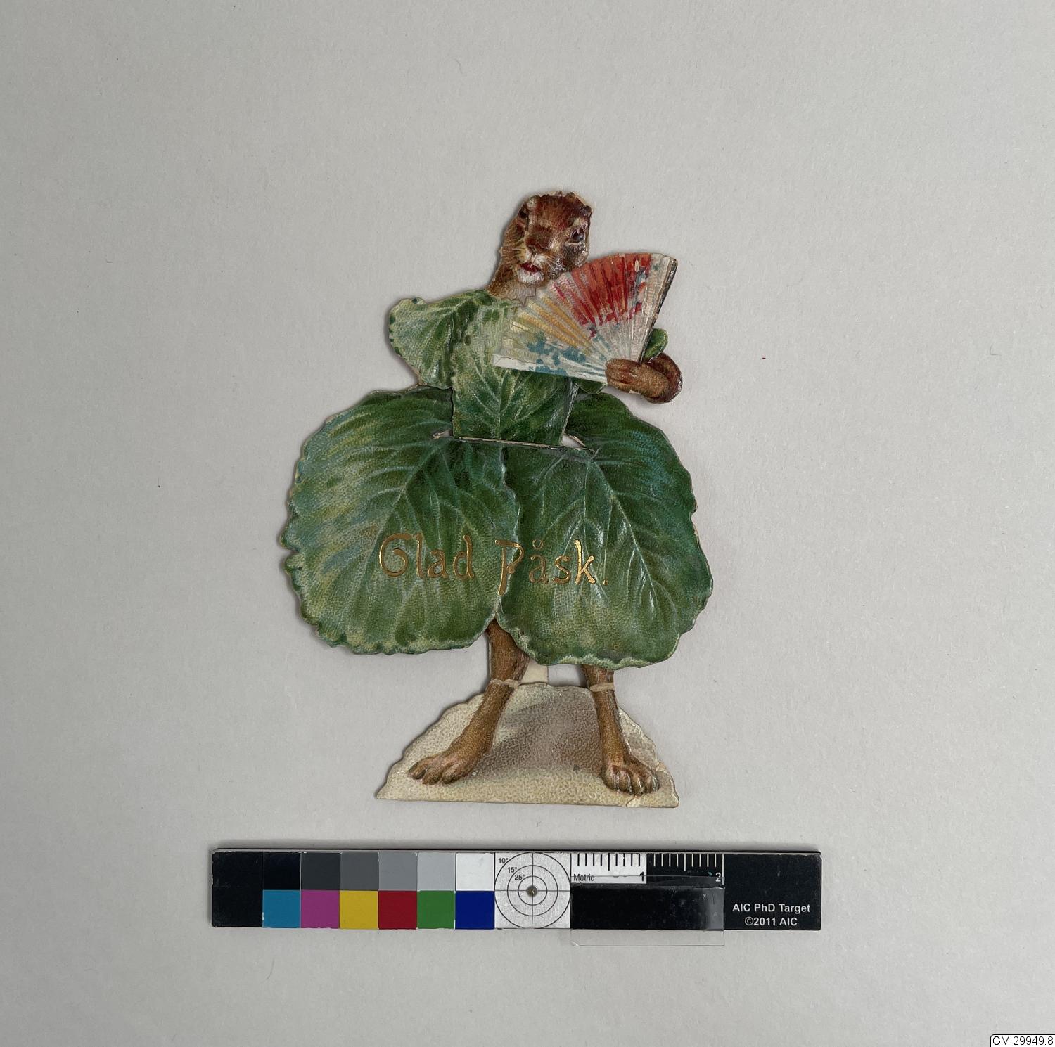 Av papp. Tryckt polykrom påskhare stående påbakbenen, iförd kålbladsklänning. Kjoldelen hänger lös runt midjan. Text "Glad Påsk". Har stöd på baksidan för att kunna stå upp. Trasig, saknar öron och en framtass.