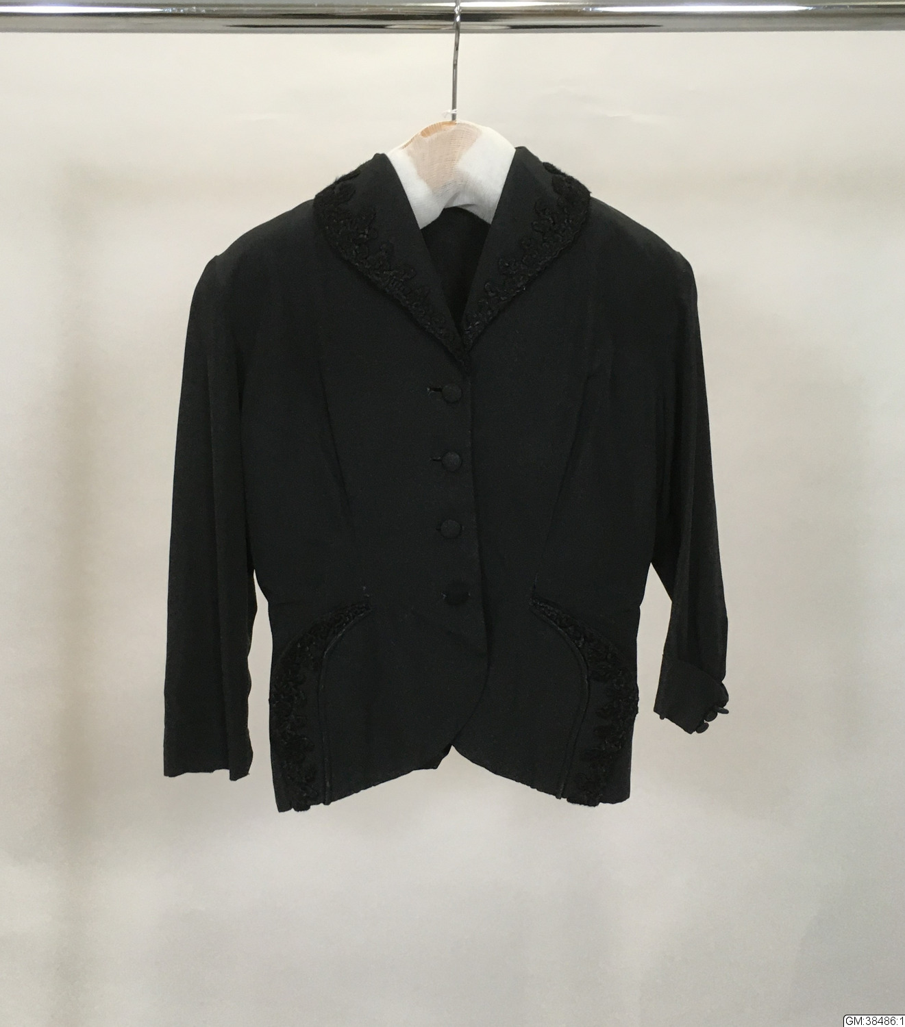 GM:38486:1-2 = damdräkt i två delar. Av svart ripssiden. 1) Jacka, insvängd i midjan. Schalkrage, som är dekorerad med svarta sniljer liksom de inskurna fickorna. Axelvaddar. 2) Kjol, rak med ett motveck bak och blixtlås i sidan.