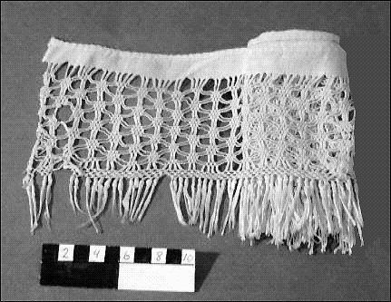 Material: lin#Teknik: flätat#En vävbredd lärft av vänsterspunnet lingarn. 32 varptrådar på 2 cm, fyrflätning med åtta trådar. Flätningen är 5 cm, fransen 5 cm.#Nött, något trasig, lagad, fläckig. Tvättad januari 1970.